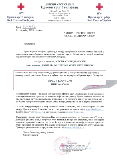 Молимо Вас, ако сте у могућности, да узмете учешће у акцији и уплатите једнократну новчану помоћ у складу са Вашим могућностима на жиро рачун Црвеног крста Свилајнац: