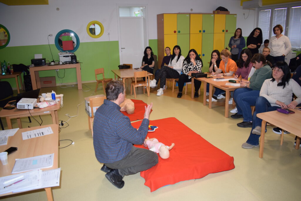 Обуку су реализовали лиценцирани предавачи Црвеног крста Србије за прву помоћ а посебан акценат је стављен на потенцијалне повреде и стања код деце која бораве у предшколској установи. Едукацију за ове специфичне повреде и стања реализовали су Специјалисти ургентне медицине Др Реља Момчиловић и Др Векослав Зајић.